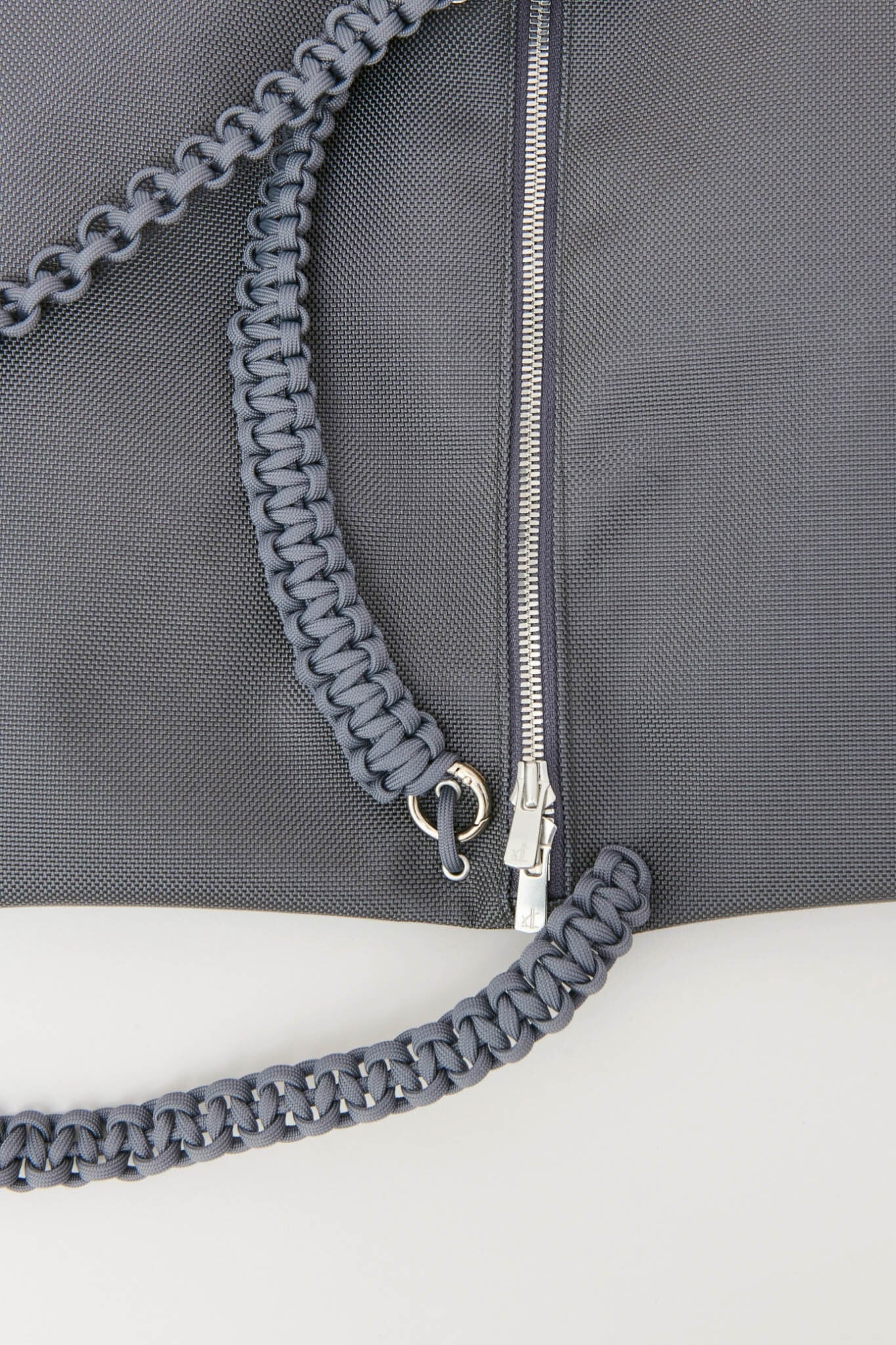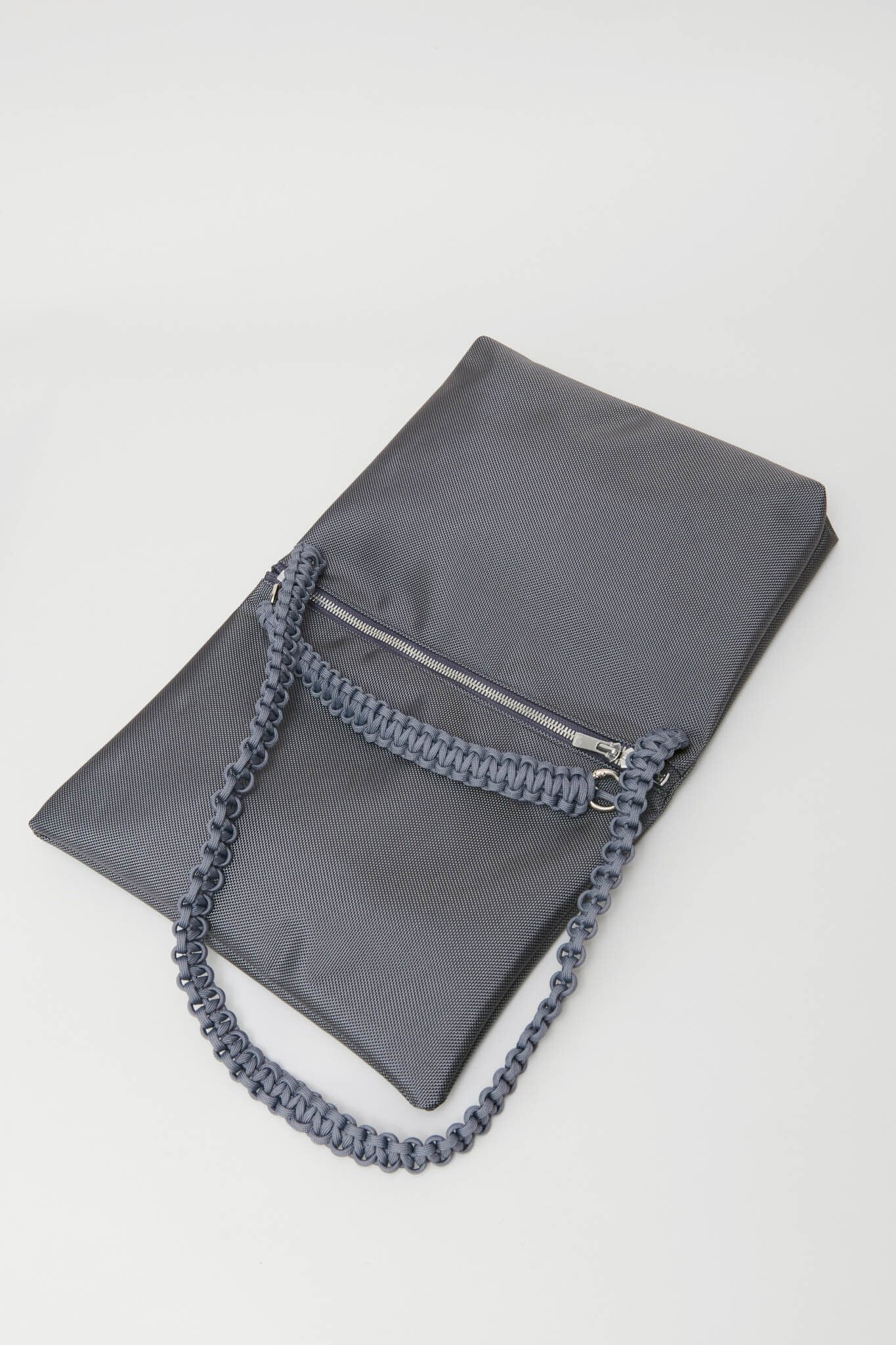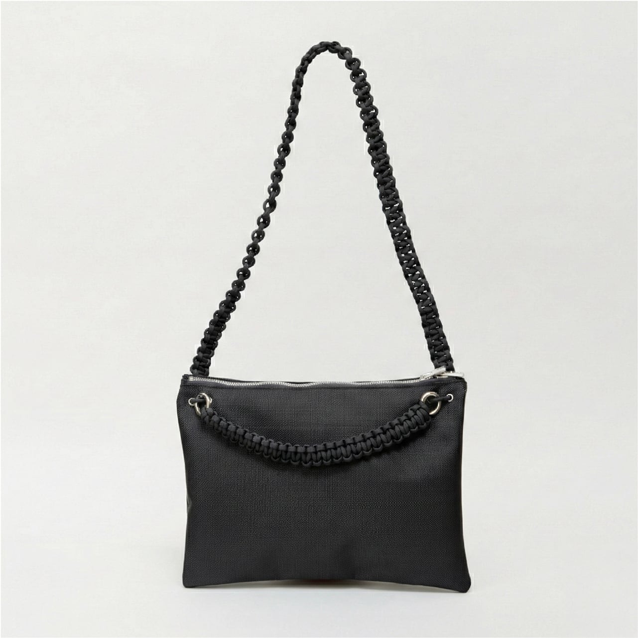 さらに、合計13mの紐をすべて手編みしたこだわりのハンドルや、自由な位置で開閉できるダブルファスナーを採用。二つ折りにすると中央に仕切りが生まれる構造で、デザイン性と優れた実用性を兼ね備えたバッグです。